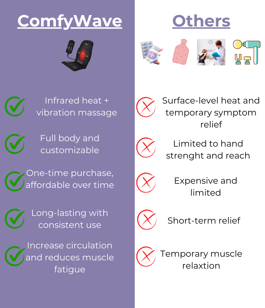 Unlike quick fixes, this full-body massage chair cushion goes beyond surface-level relief. Equipped with infrared heat therapy and targeted vibration massage, COMFYWAVE penetrates deep into your muscles to relieve tension, improve circulation, and soothe those persistent aches. Portable and versatile, it provides professional-quality massage wherever you are—at home, in the car, or the office.
